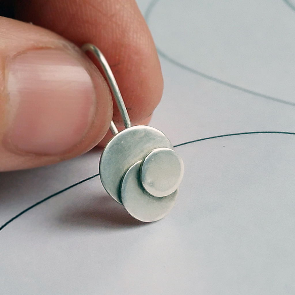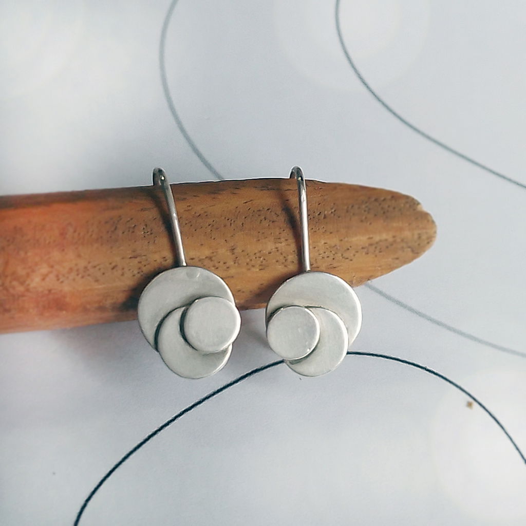 Aros de plata artesanales y originales con cierre seguro trasero, realizados en un calibre ideal para que no se deforme con el uso. Tres círculos, la tríada de la vida.