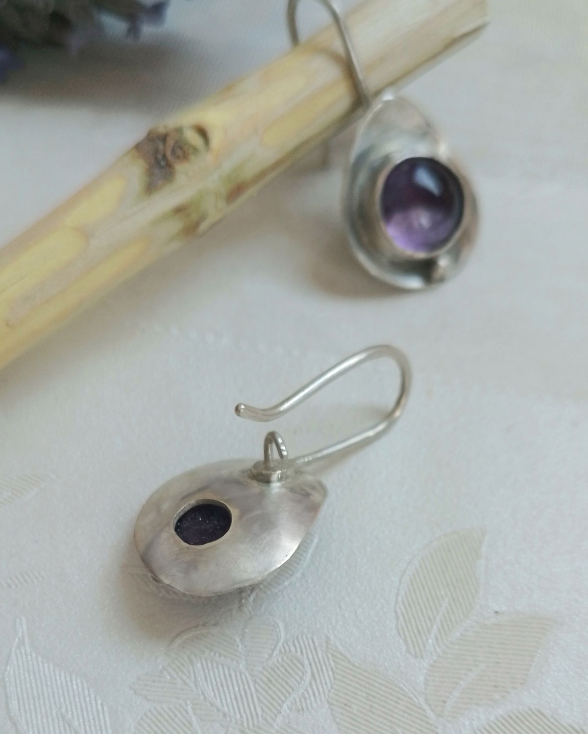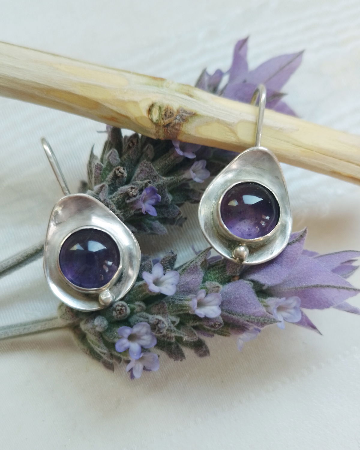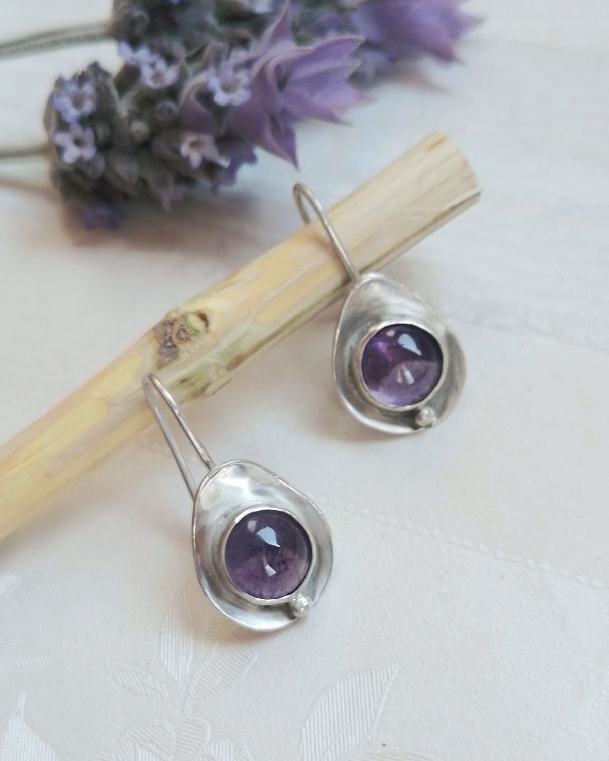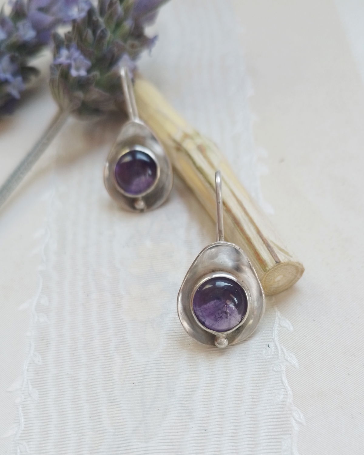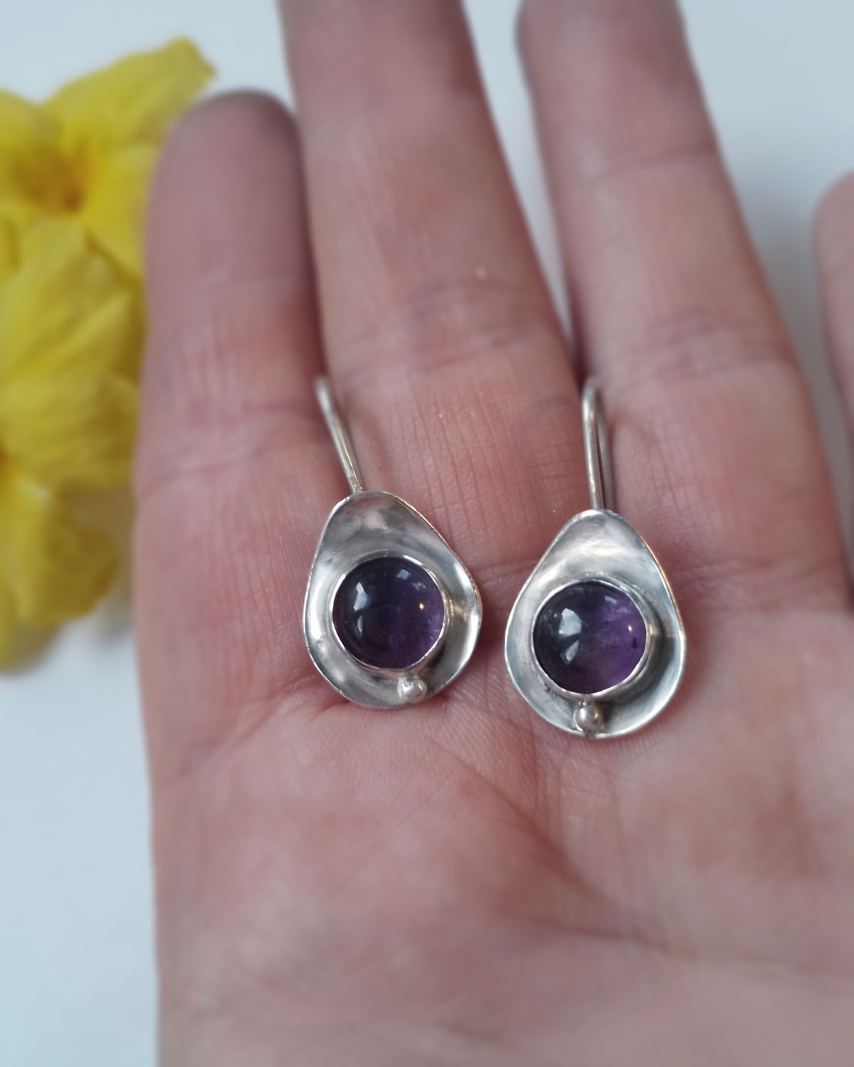 Esta variante de mis aros Ovo trae un domo (bolita) que acompaña a las amatistas redondas.