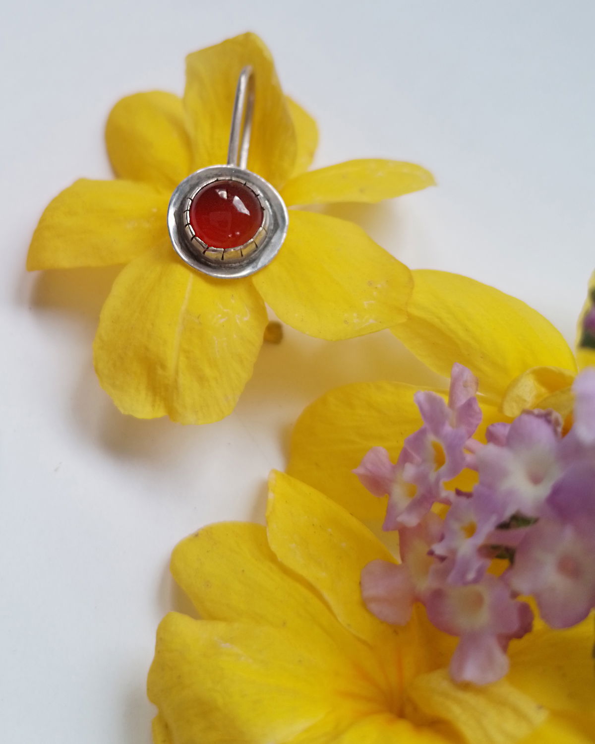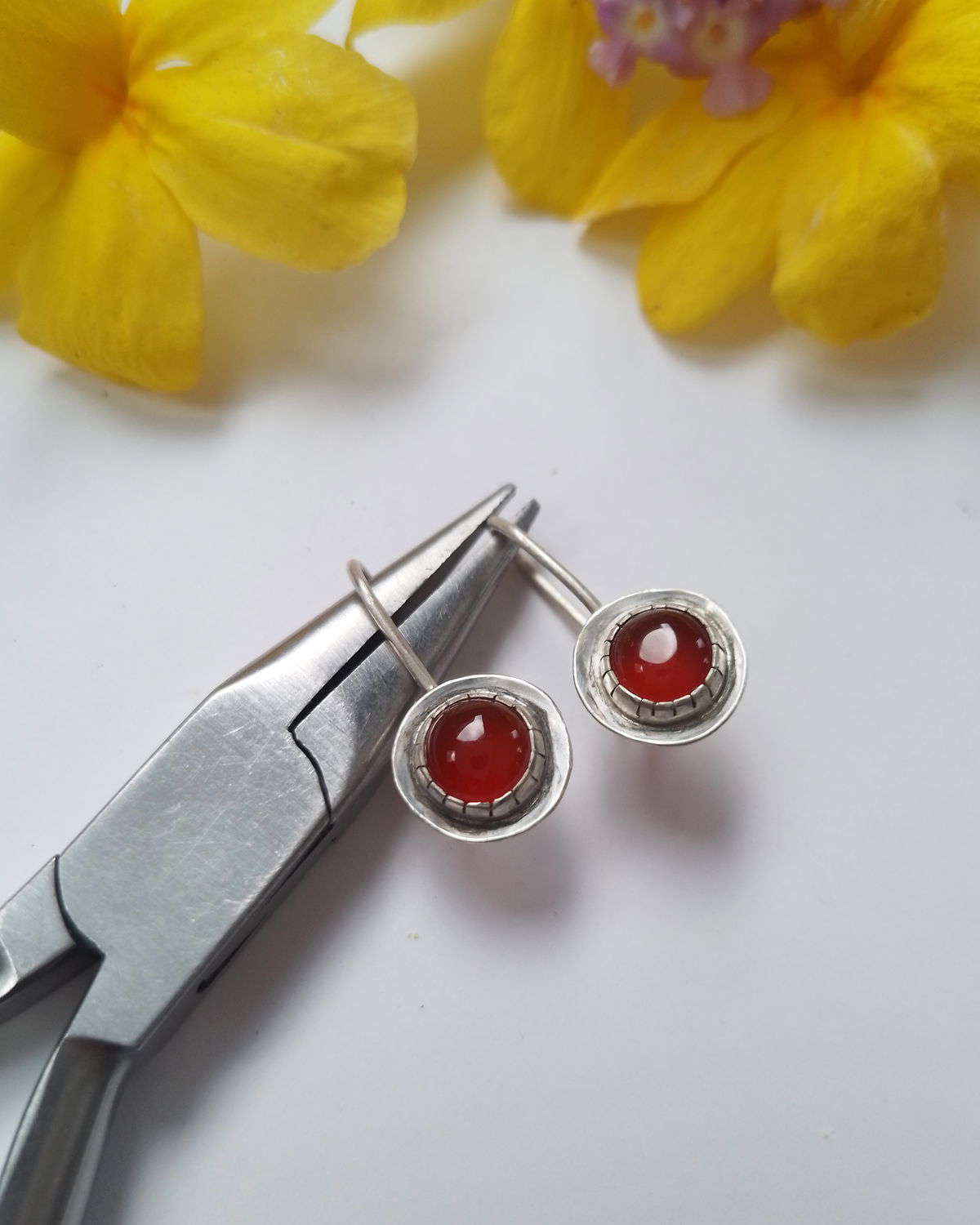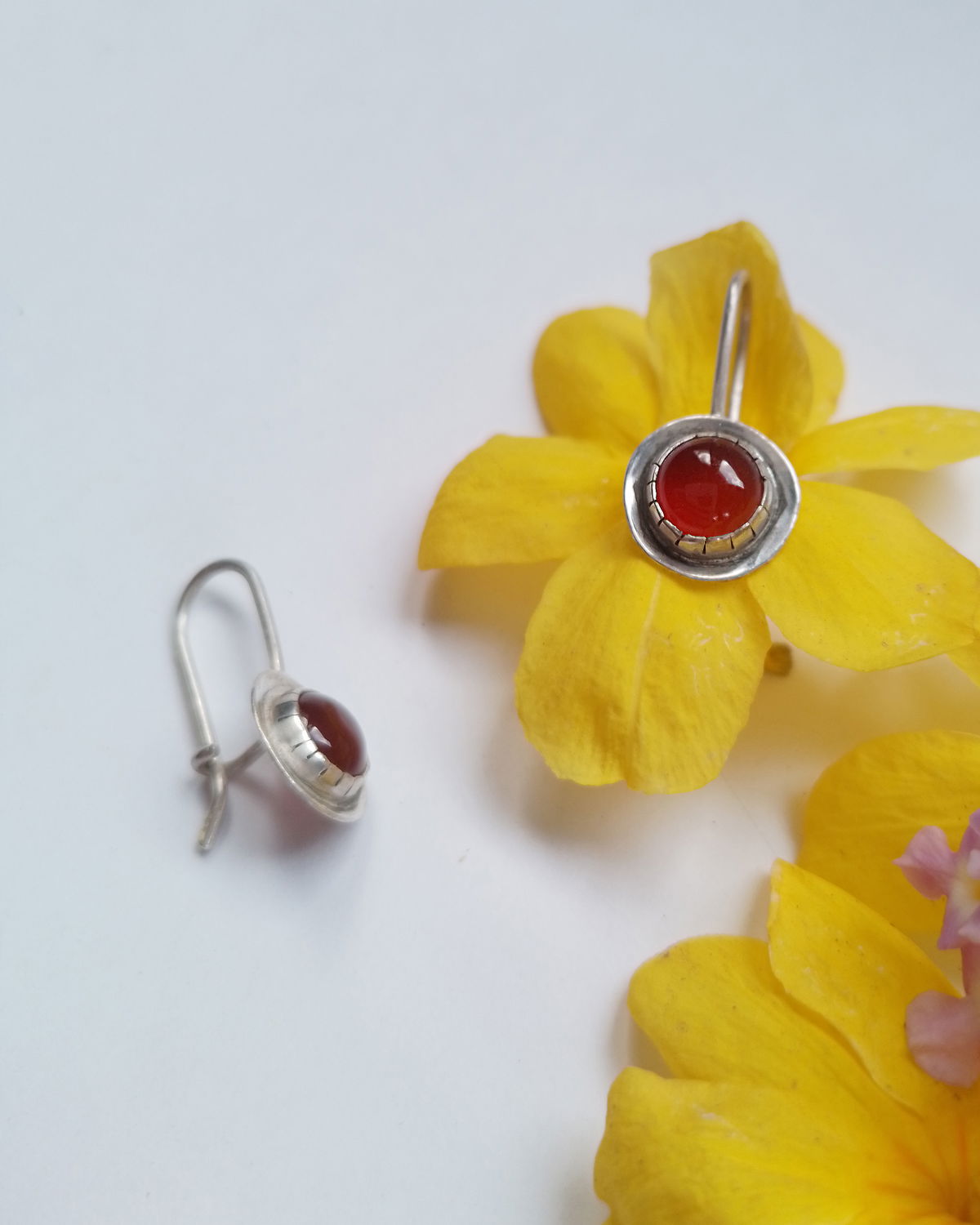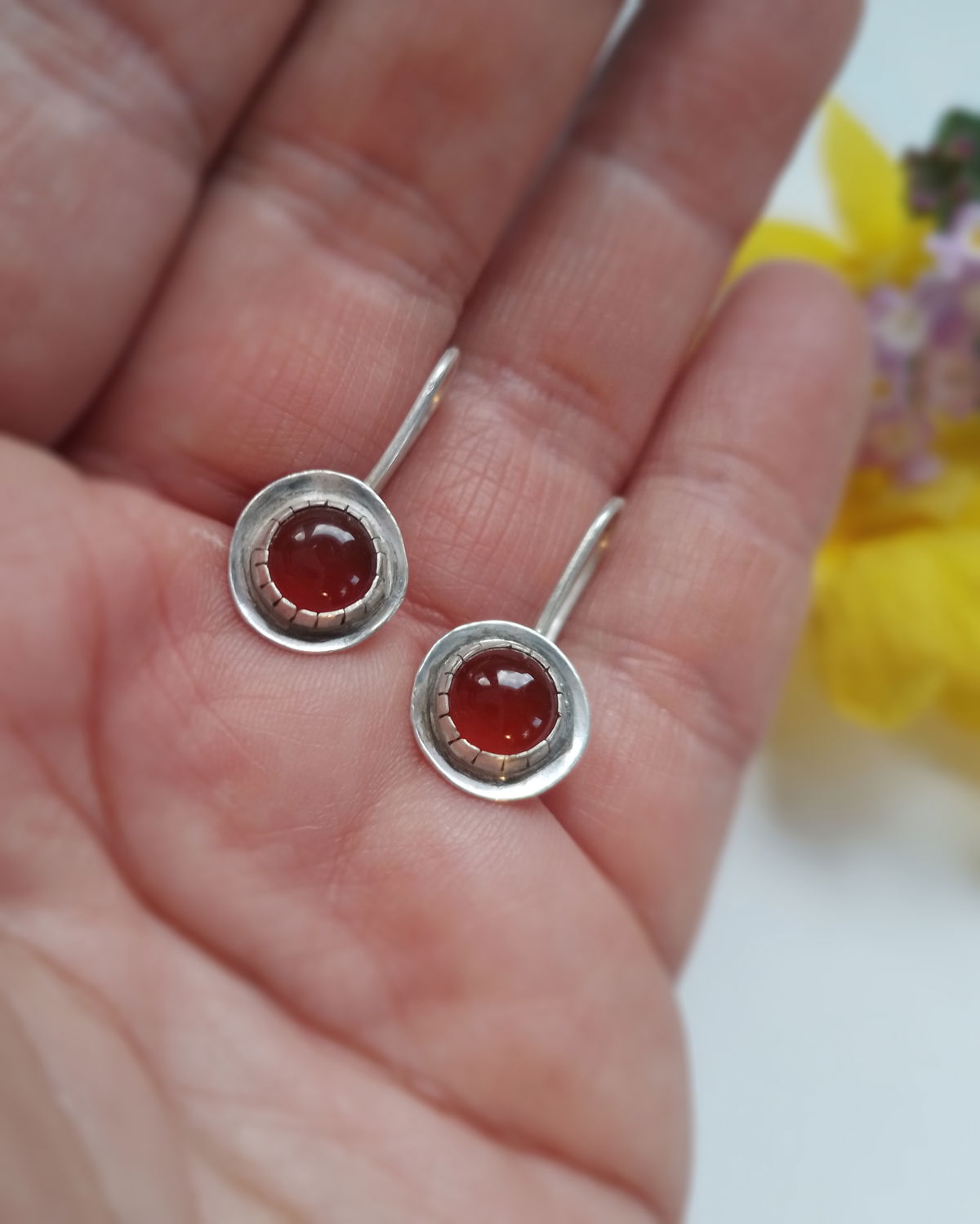 Son de Plata 925 y las piedras naturales se llaman Agatas Cornalinas... éstas son de un tono intenso entre naranja y rojizo.