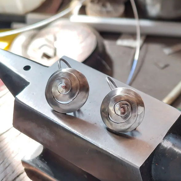 Aros con cierre seguro posterior de Plata 925, y caracolito espiralado de alpaca con un detalle de cobre al frente.