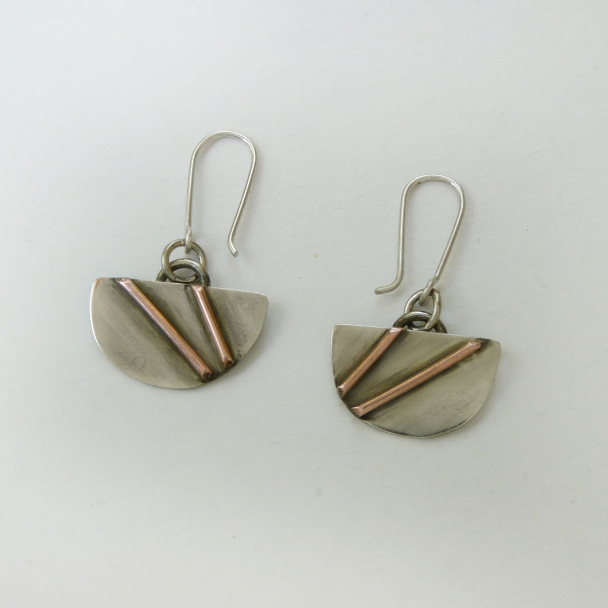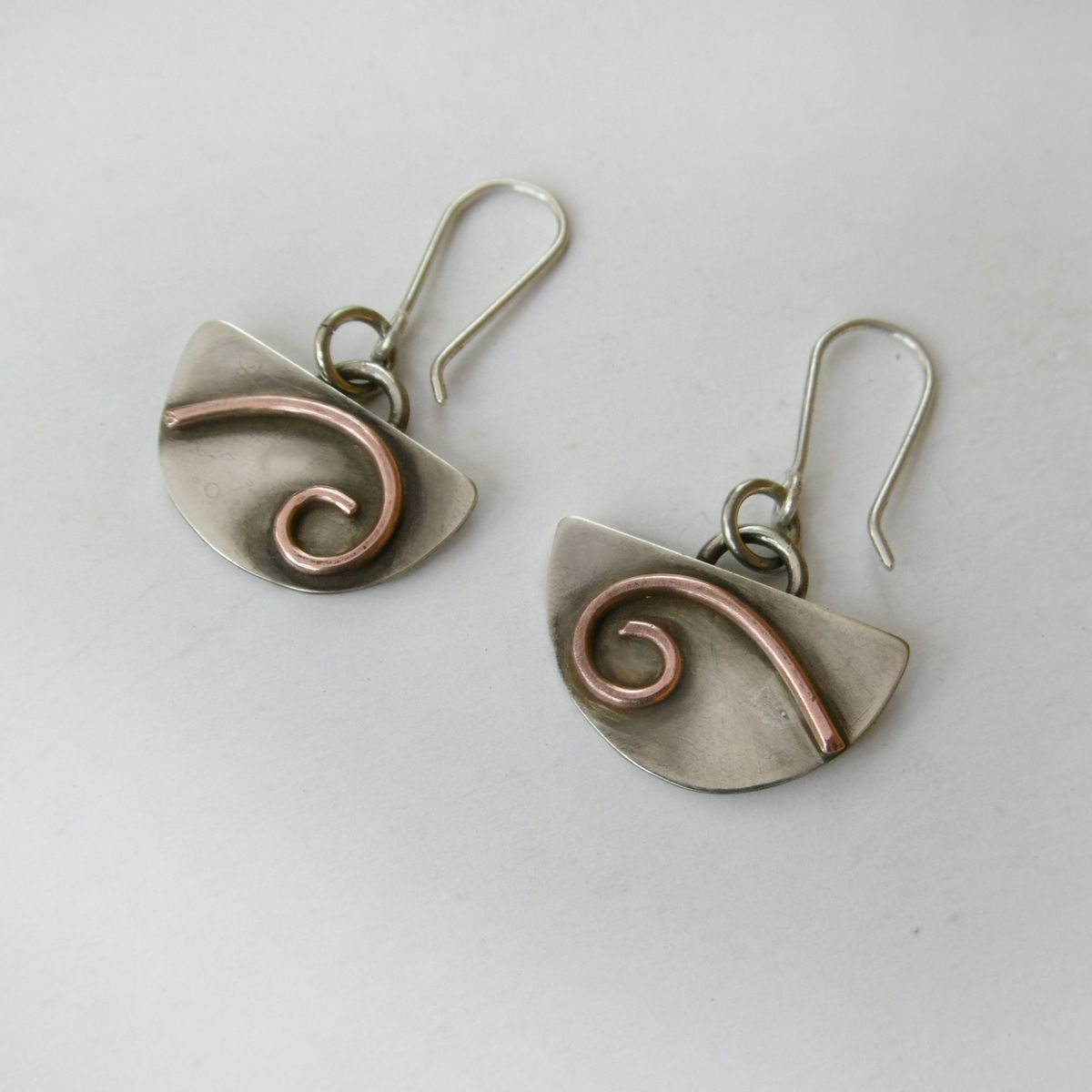 Aros pendulares de alpaca con detalle de cobre, y pasante de Plata 925. Por el momento tengo 2 variantes, espiral o rayas, vendrán otras más adelante