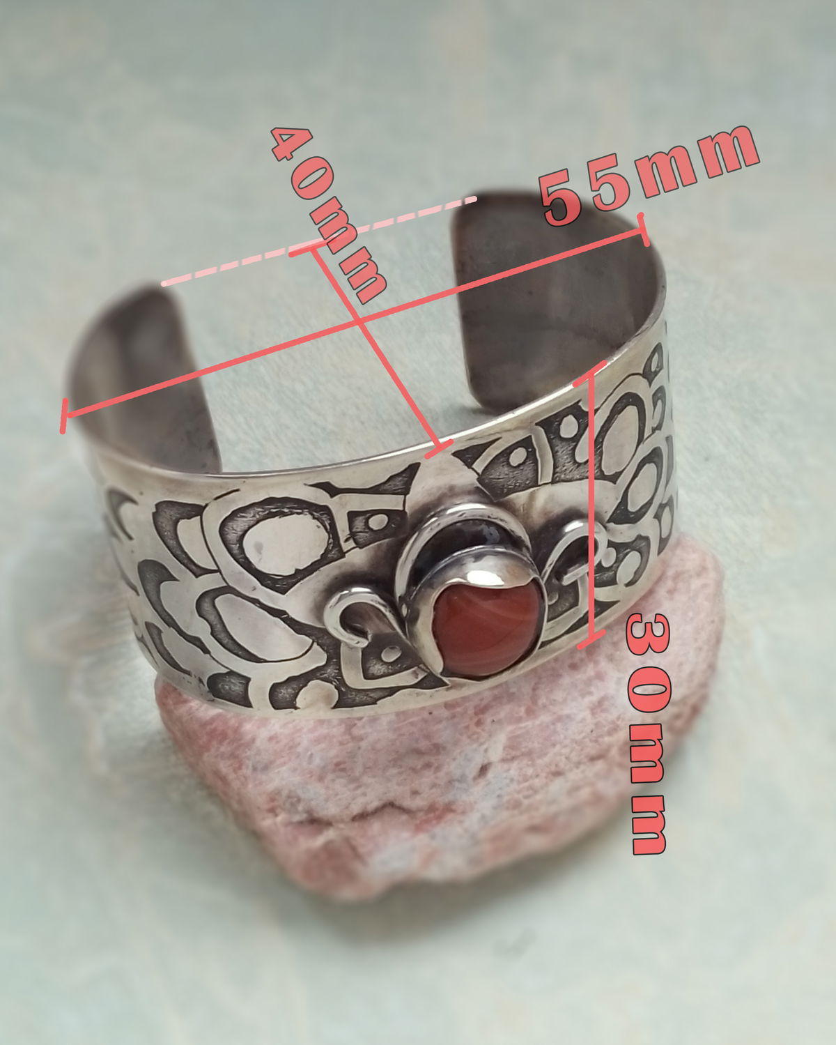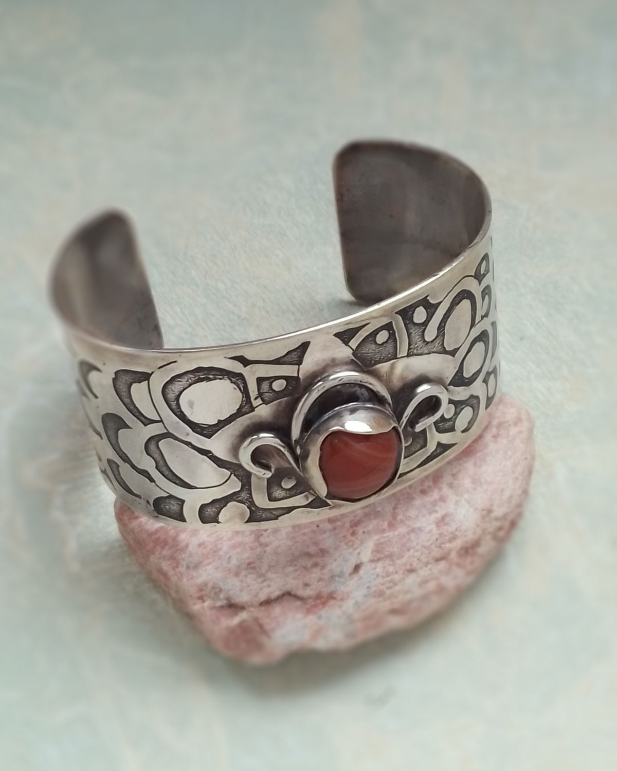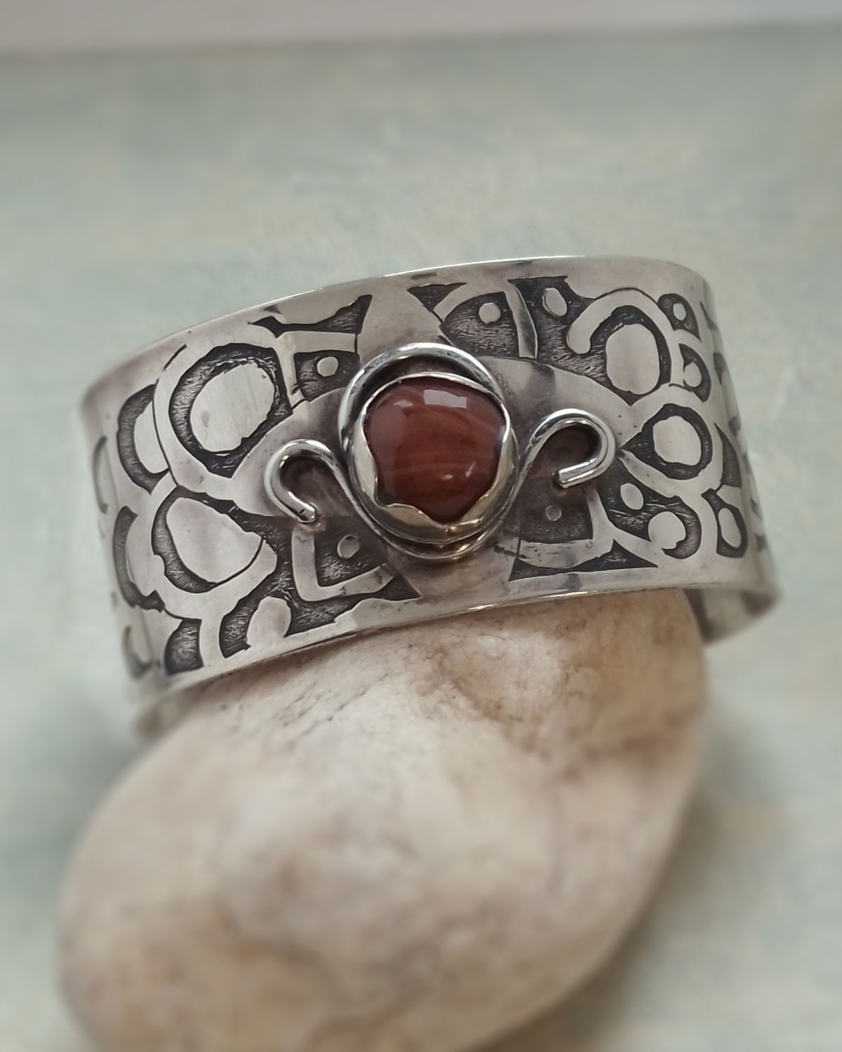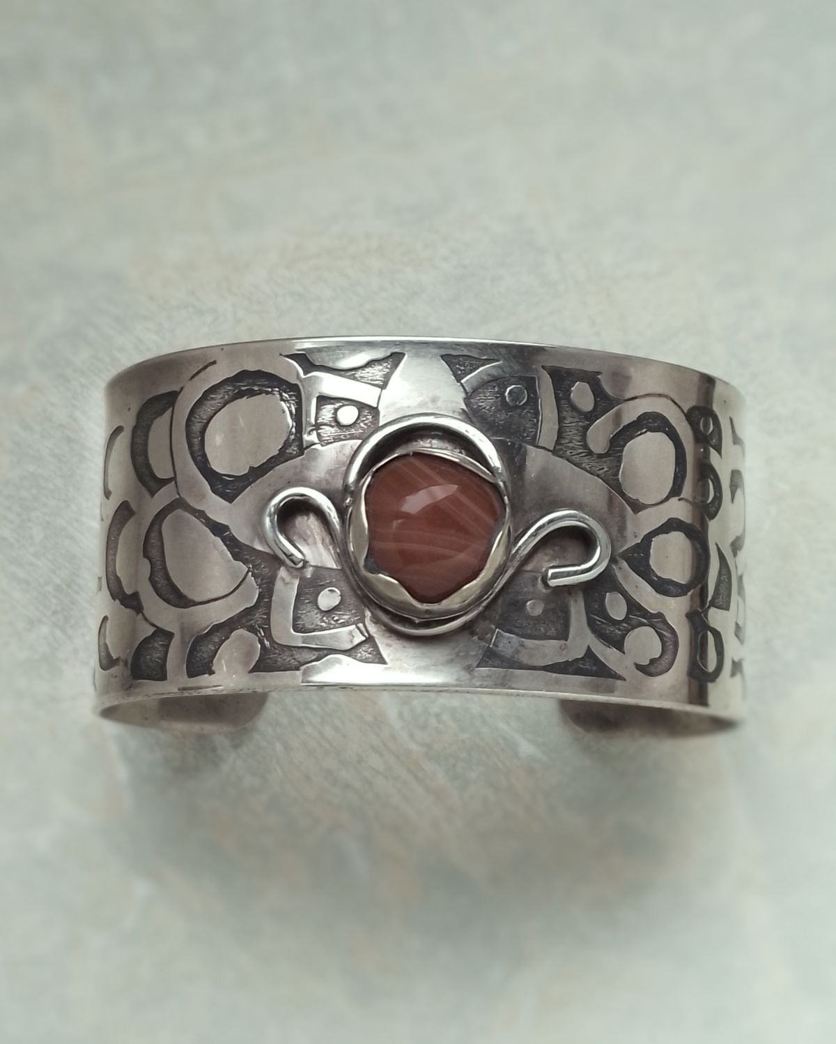 Brazalete con engarce de Ágata Cornalina. Dibujo a mano y grabado al ácido, detalles ornamentales soldados.
