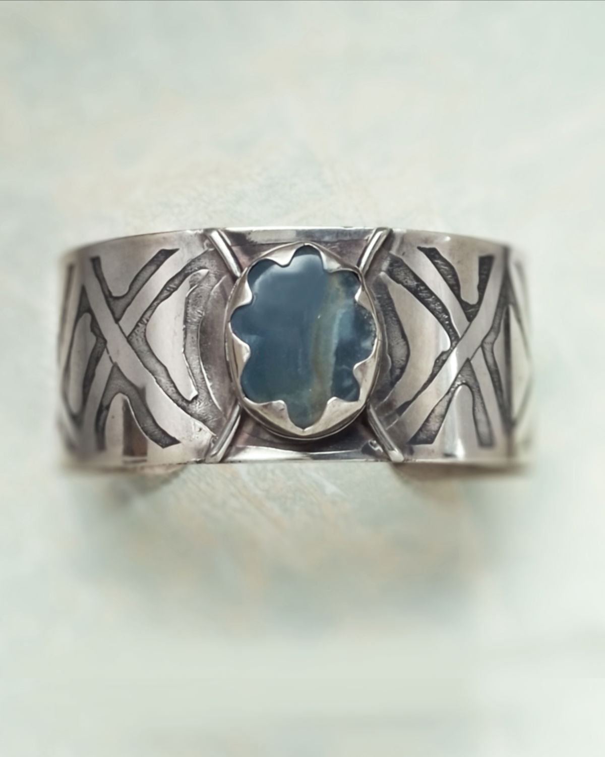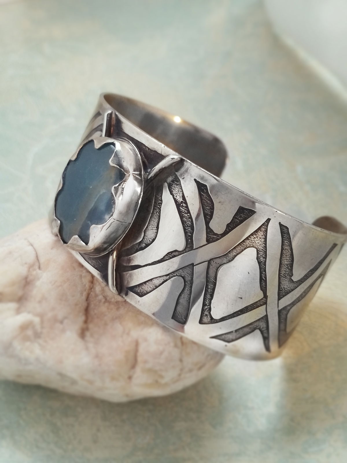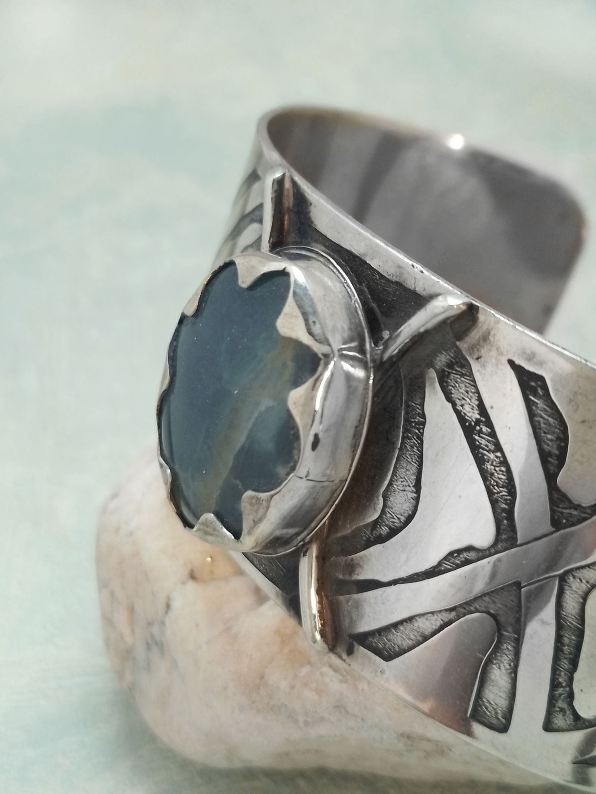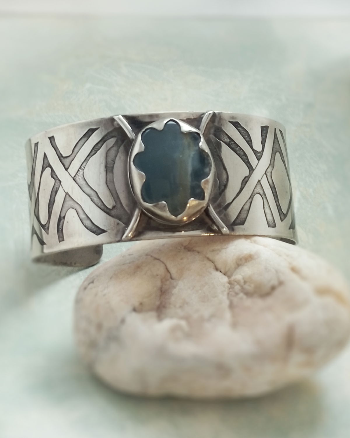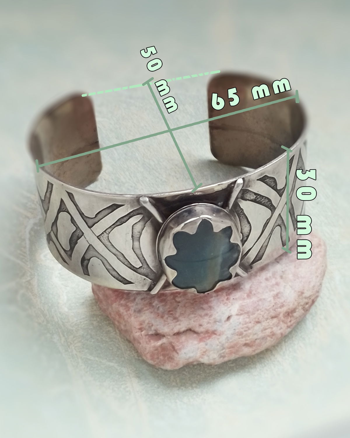 Brazalete con engarce de Ónix Cielo. Dibujo a mano y grabado al ácido, detalles ornamentales soldados.