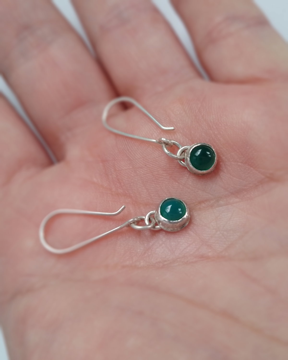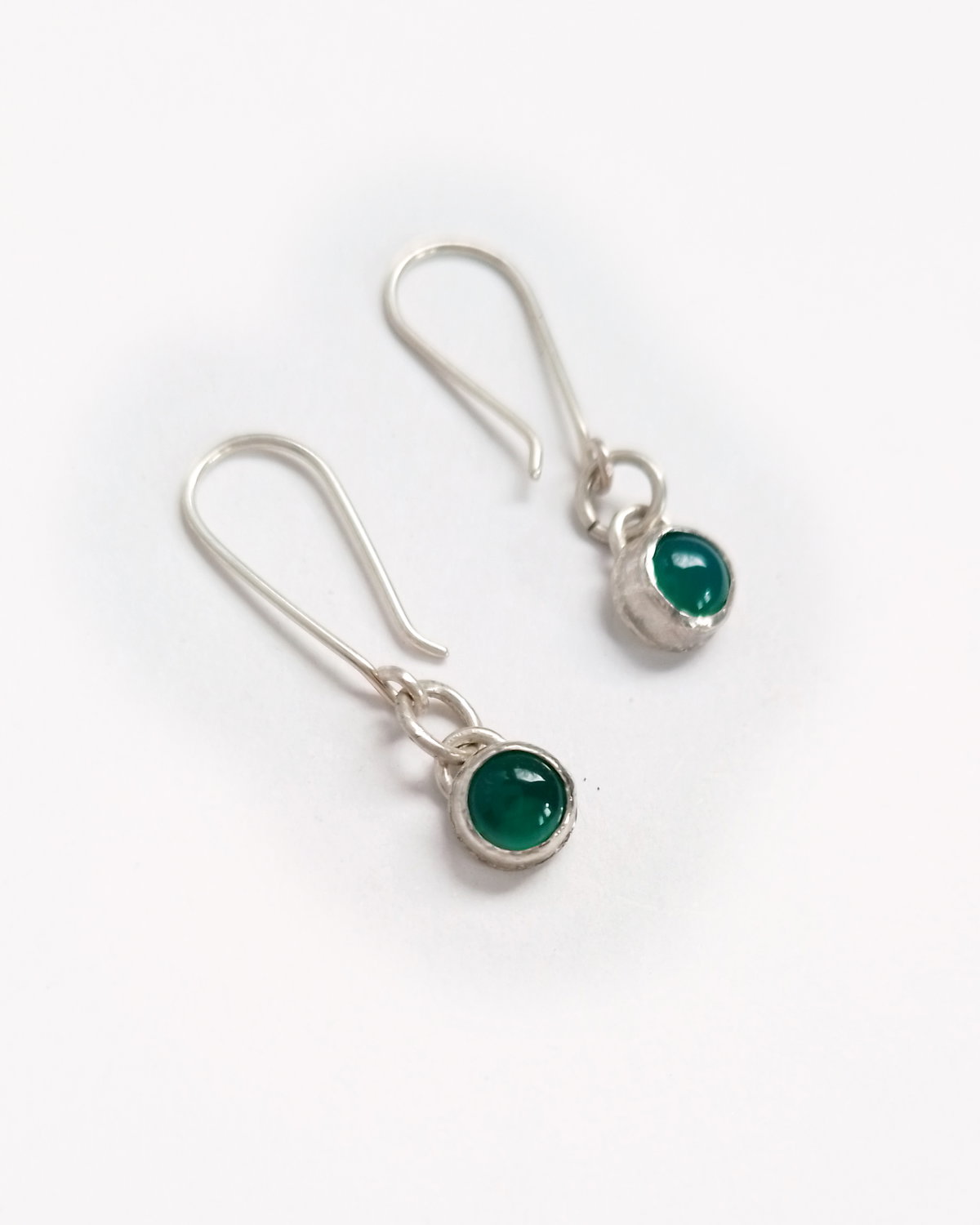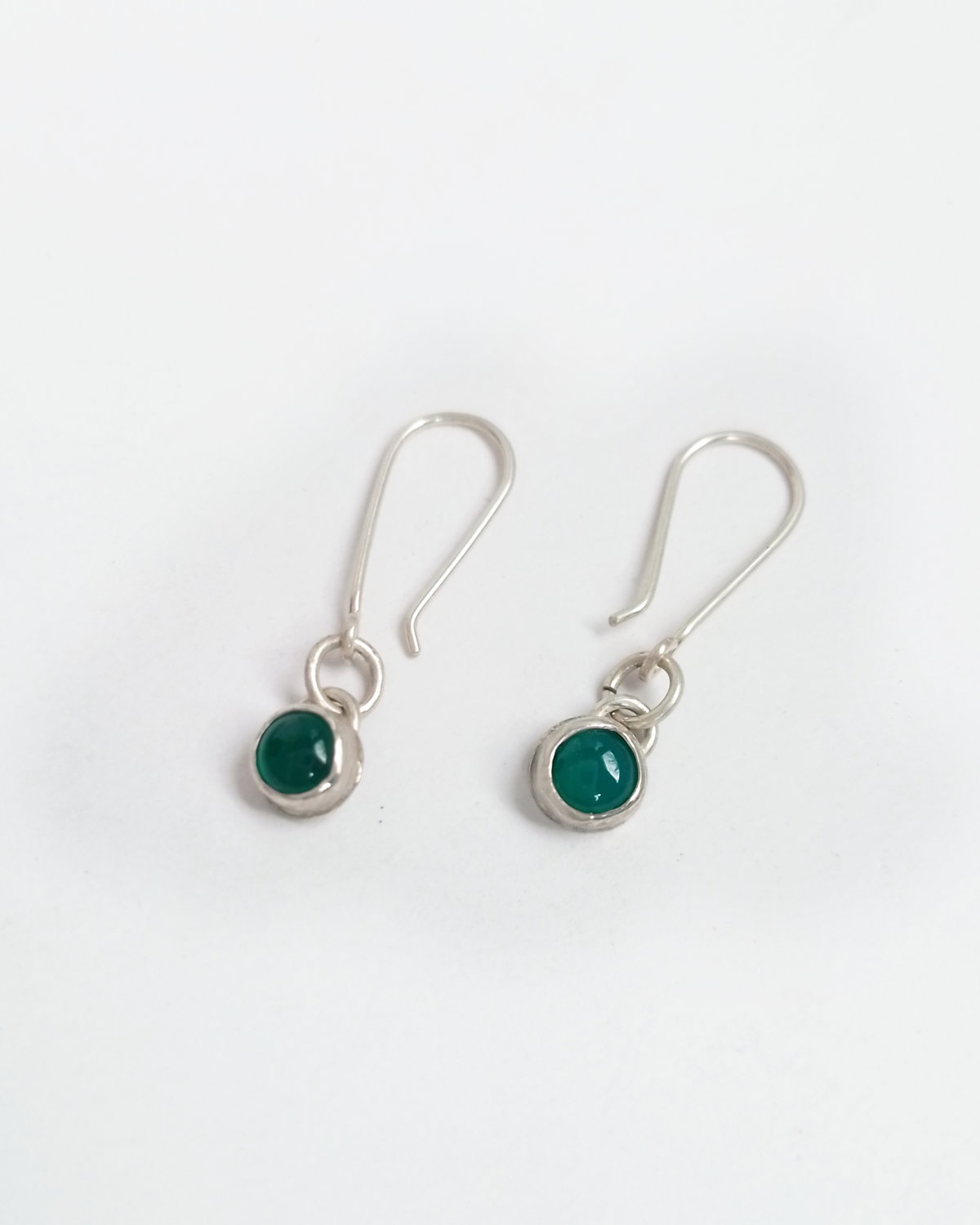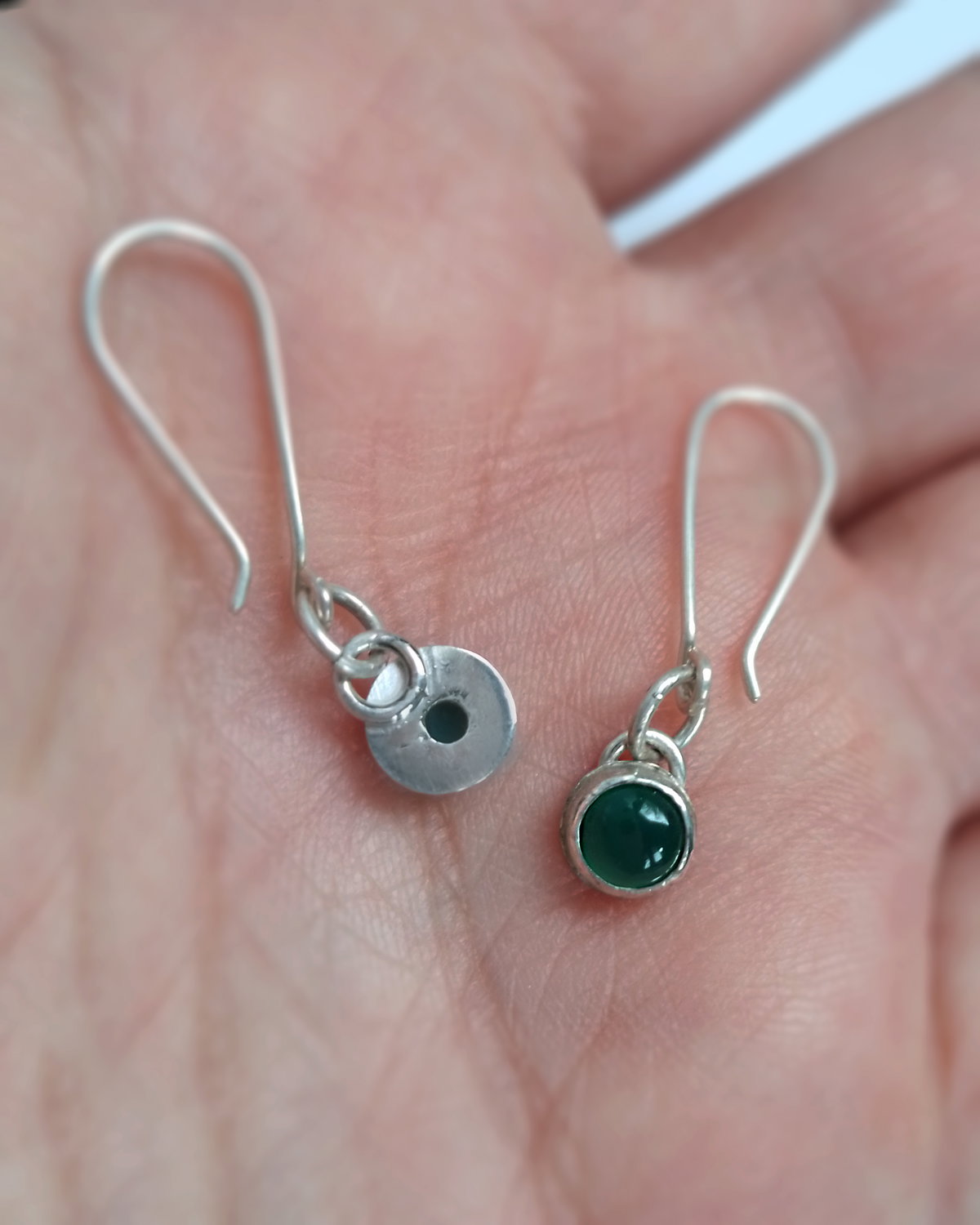 Hice estos aros en Plata 925 y las piedras naturales se llaman Agatas Verdes. Son livianos y cómodos para uso diario, los entrego con un fru fru de silicona para mayor seguridad y no se pierdan.